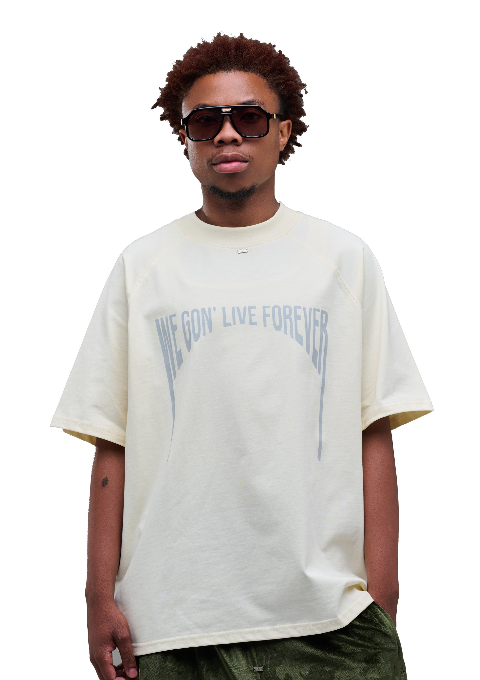 Our We Gon' Live Forever t-shirt with our word slogan in the front center in high quality screen print in grey. The t-shirt is finished with a stainless steel DEAD. detail in front of it, just below the thick collar ribbing.